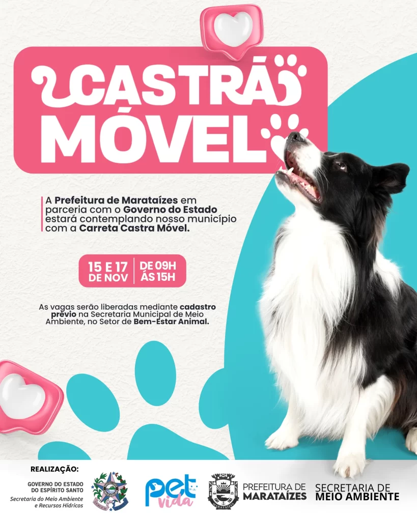 A Prefeitura de Marataízes, por meio da Secretaria Municipal de Meio Ambiente, em parceria com o Governo do Estado do Espírito Santo, vai receber nos dias 15 e 17 de novembro, a Carreta Castra Móvel, um importante serviço voltado para a castração gratuita de cães e gatos. O atendimento acontecerá das 9h às 15h, e as vagas serão liberadas mediante cadastro prévio realizado na Secretaria Municipal de Meio Ambiente, no Setor de Bem-Estar Animal. A iniciativa faz parte do programa Pet Vida, coordenado pela Secretaria de Estado do Meio Ambiente e Recursos Hídricos, e tem como objetivo promover o controle populacional de animais, além de estimular a posse responsável e contribuir para a saúde pública. A Prefeitura de Marataízes segue comprometida com ações que unam cuidado, responsabilidade e desenvolvimento, buscando constantemente parcerias e investimentos que beneficiem toda a comunidade.