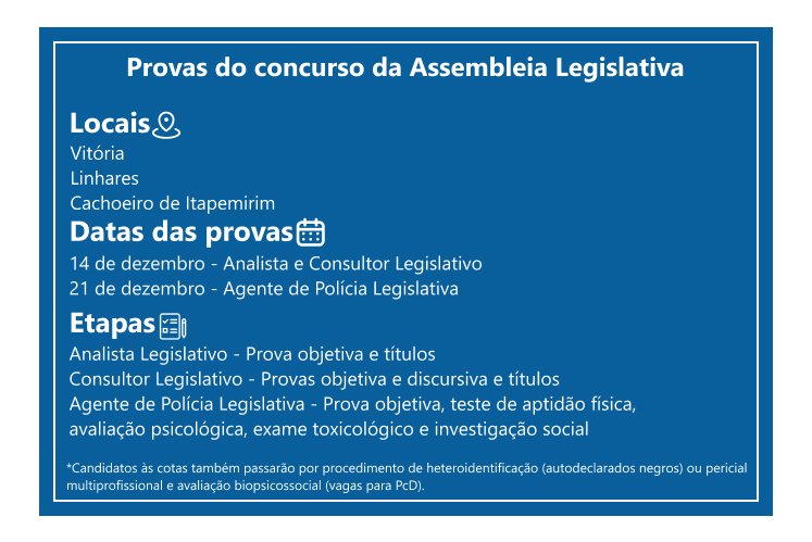 As provas do concurso da Ales serão realizadas em duas datas distintas: no dia 14 de dezembro, para os candidatos aos cargos de nível superior, sendo 5 vagas para Analista Legislativo e 15 vagas para Consultor Legislativo; e no dia 21 de dezembro, para os inscritos no cargo de Agente de Polícia Legislativa, que conta com 15 vagas.