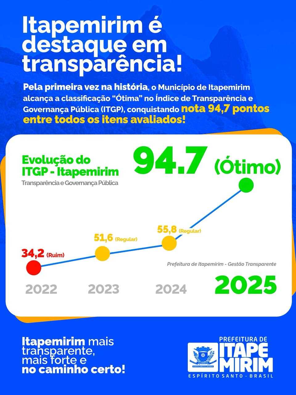 Pela primeira vez em sua história, o município de Itapemirim alcançou classificação “ÓTIMA” no Índice de Transparência e Governança Pública (ITGP), com nota de 94,7 pontos em todos os itens avaliados.